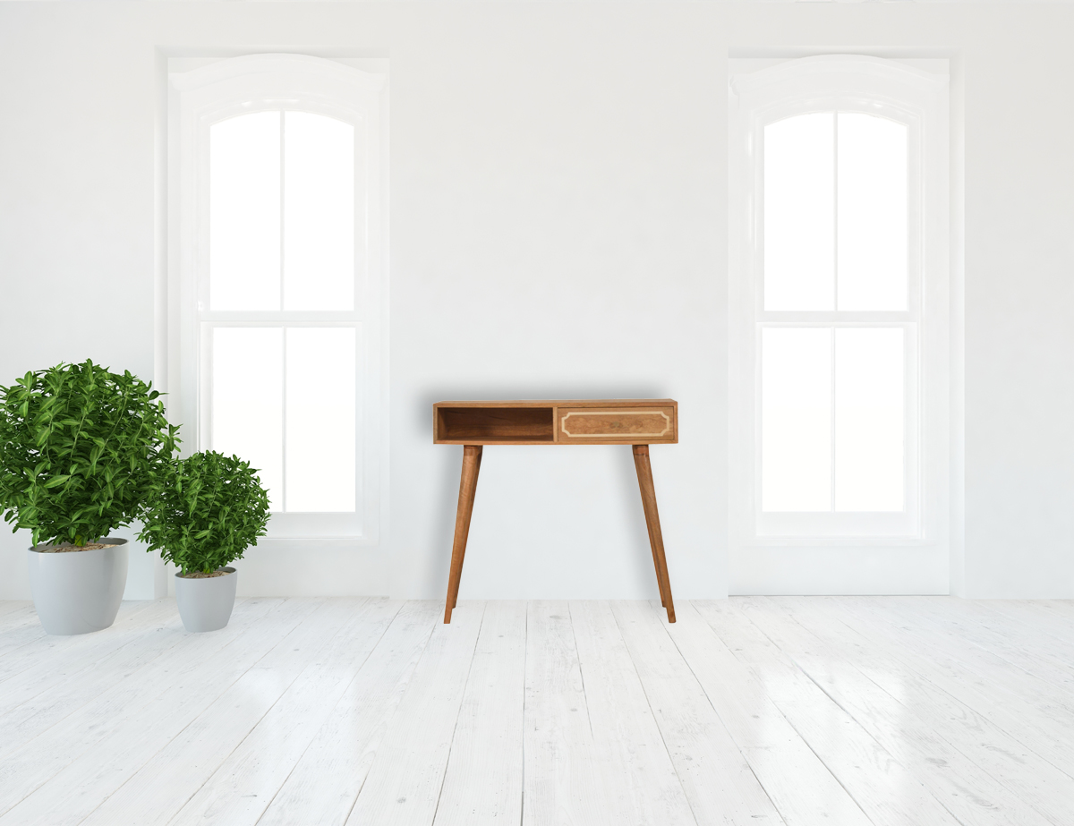 Constructed from 100% solid mango wood this desk features both a open slot and a drawer suitable for working and studying from home. It has a sleek compact design with nordic style legs and a shiny brass knob.