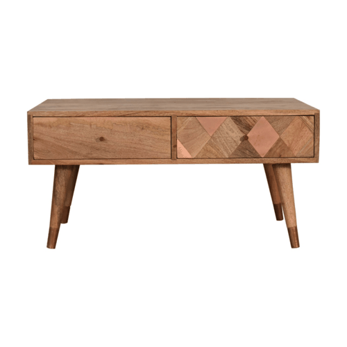 This solid timber coffee table is expertly constructed from 100% solid mango wood in an oak-ish finish and has a clean and simple design to suit most homes. It features 2 drawers featuring one beautiful copper insert on the drawer front and 4 Nordic style legs which have plating on the feet for extra detail.