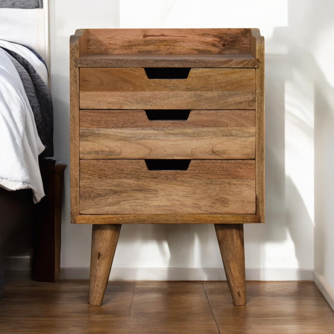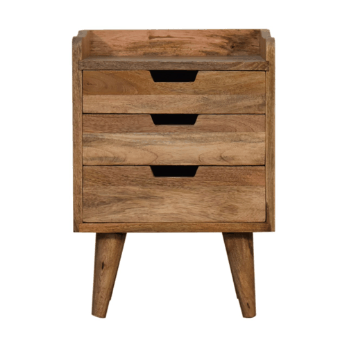 A mini version of our popular IN139, this mini gallery back nightstand table is the perfect stand for any bits and pieces you wish to keep nearby before bedtime. It features ample space for a lamp, photo frame, or any ornaments. It has been constructed from 100% solid mango wood with a chestnut finish body. Some other product characteristics are 4 Nordic solid wood legs and cut-out slots for easy access to and from the drawers. Its simple and clean design and size is ideal for small spaces and apartments.