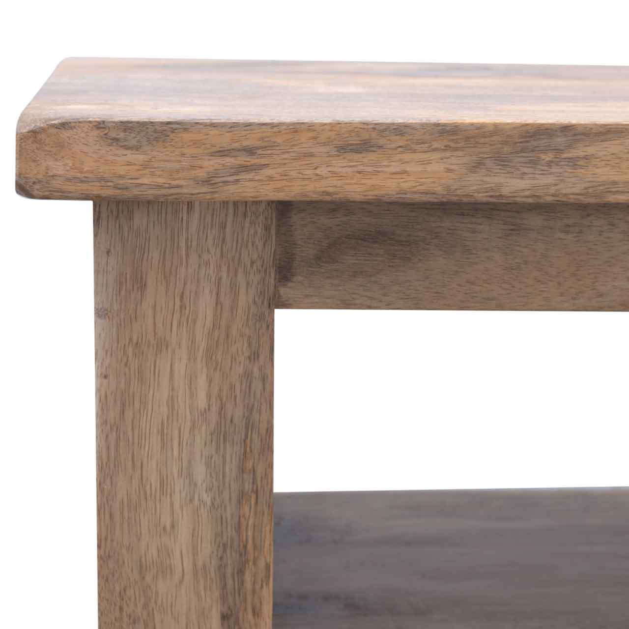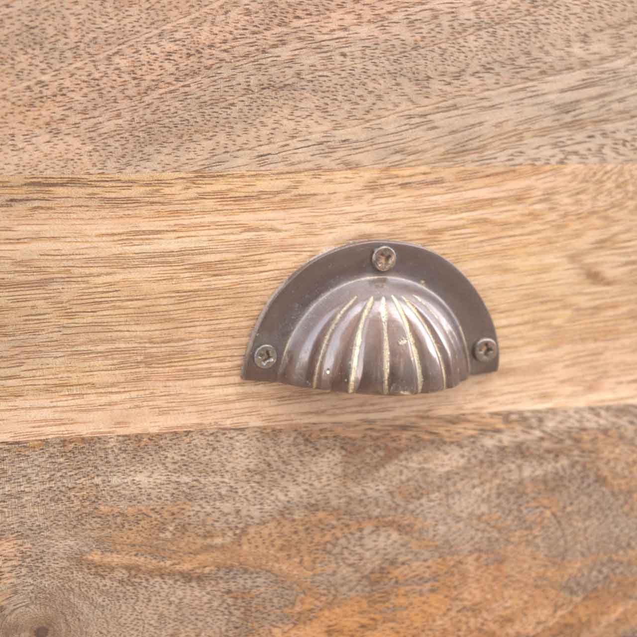 This 3 Drawer, two shelf country style media unit has been made from 100% solid mango wood and features farm house feet, shiny shell handles, oak-ish finish and a chunky mango wood top. This unit is perfect for an entertainment system. Its drawers can hold DVDs, CD’s, etc. while the shelves can hold the additional appliances like Sky boxes, etc. As for a TV, the unit can support a small to medium sized TV on the top.