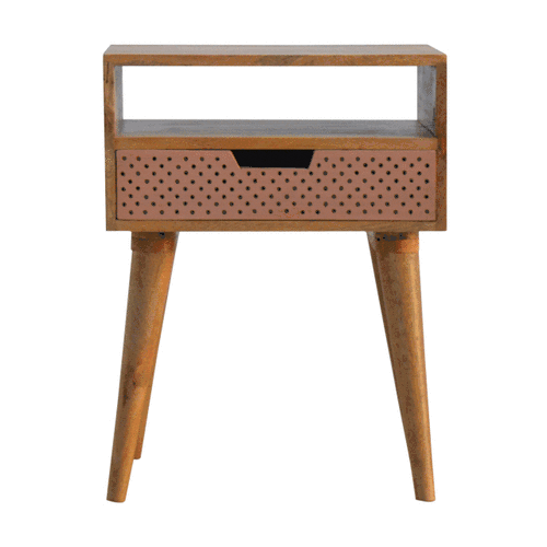 This nightstand table has been constructed from 100% solid mango wood and features 1 perforated drawer front in a copper finish which compliments the oak-ish body perfectly. It stands on 4 Nordic style legs and has 1 drawer and an open cut out slot. It can be partnered with the other pieces from the the copper front collection or stand alone as an accent piece in the bedroom.