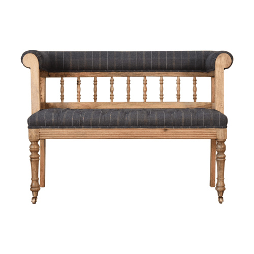 Add some luxury style to your home living area with this fabulous country hallway bench. It is constructed from 100% solid mango wood and upholstered in 100% pewter tweed. Other features include detailed hand carved and hand turned front legs with casters and an overall oak-ish finish. You may encounter variations from batch to batch hence if you are looking to pair products under similar room settings; you can opt for a bespoke order or take an informed decision about the possible variations.