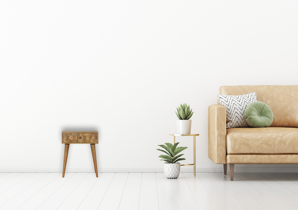 Enjoy the minimalist design of this nightstand, constructed from 100% solid mango wood in an oak-ish finish with beautiful pineapple hand carved design on the drawers. It features 4 Nordic style legs and one drawer to take care of everyday utility items. This nightstand table will add a definite and lasting character to your bedroom.