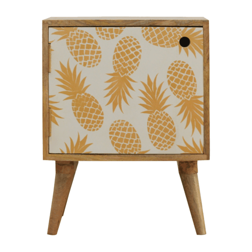 This nightstand has been constructed from 100% solid mango wood and finished in a fine oak-ish finish body. The main features of this piece is the screen printed door front which has a beautiful pineapple design giving the piece extra dimension and character and allowing you to store any bits and pieces discreetly. It also has 4 Nordic style legs and ample space on top for a lamp, photo frames or ornaments.