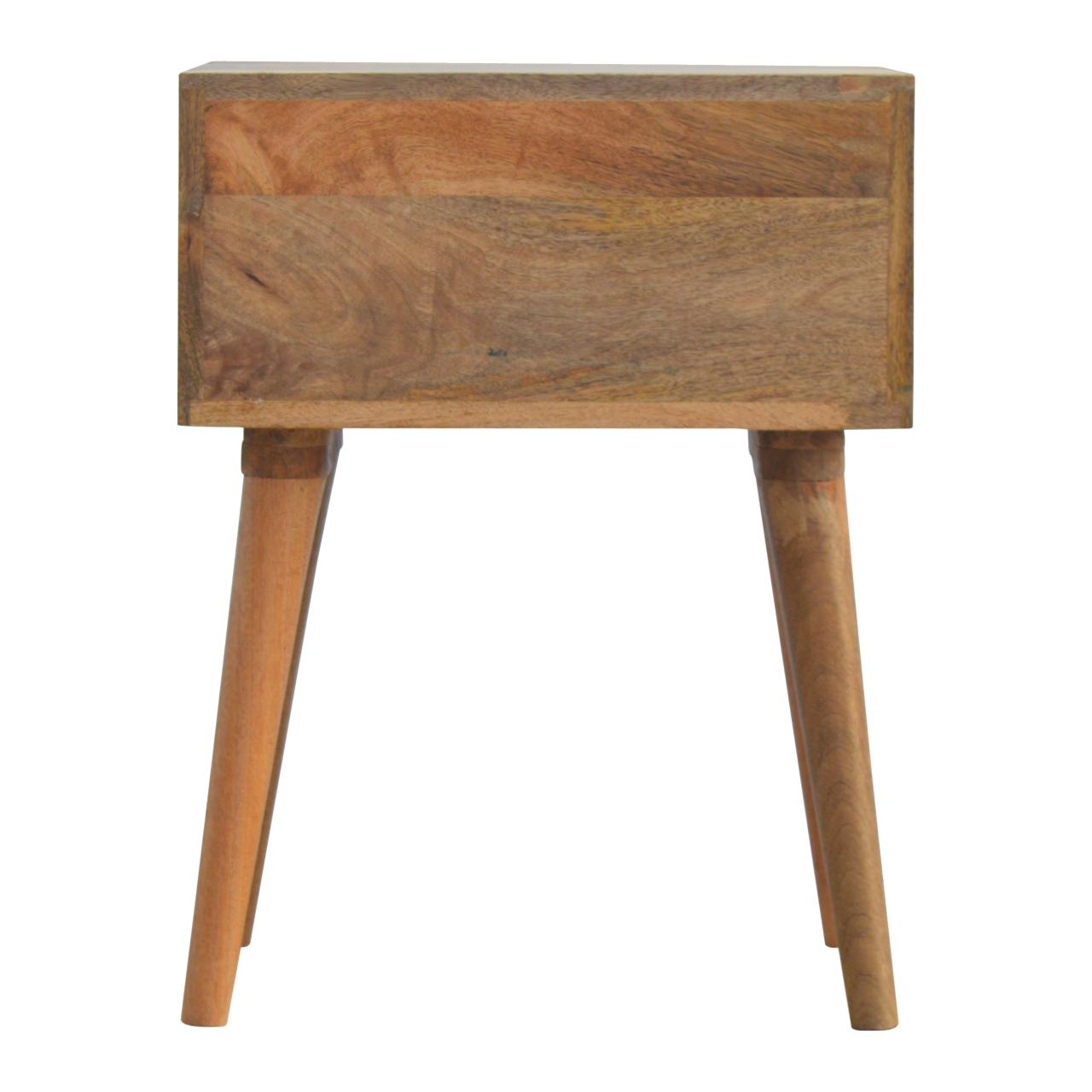 This nightstand table is a versatile piece that will prove handy all over your home and provide storage for any bits and pieces before bed. It has been made from 100% solid mango wood with has a fine oak-ish finish. It also comes with 2 pink floral screen printed drawers that have glass knobs and 4 Nordic-style legs.