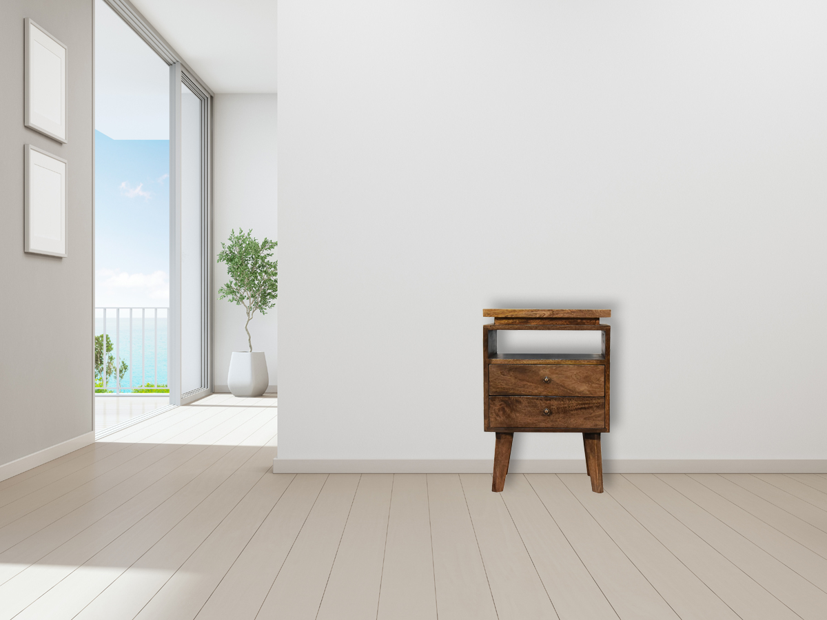 This Platform nightstand Table is a highly functional and stylish piece. It features 2 small drawers and a open slot for convenient storage space. It’s unique design offers an elevated platform base, and othert features include nordic style legs and shiny brass knobs.