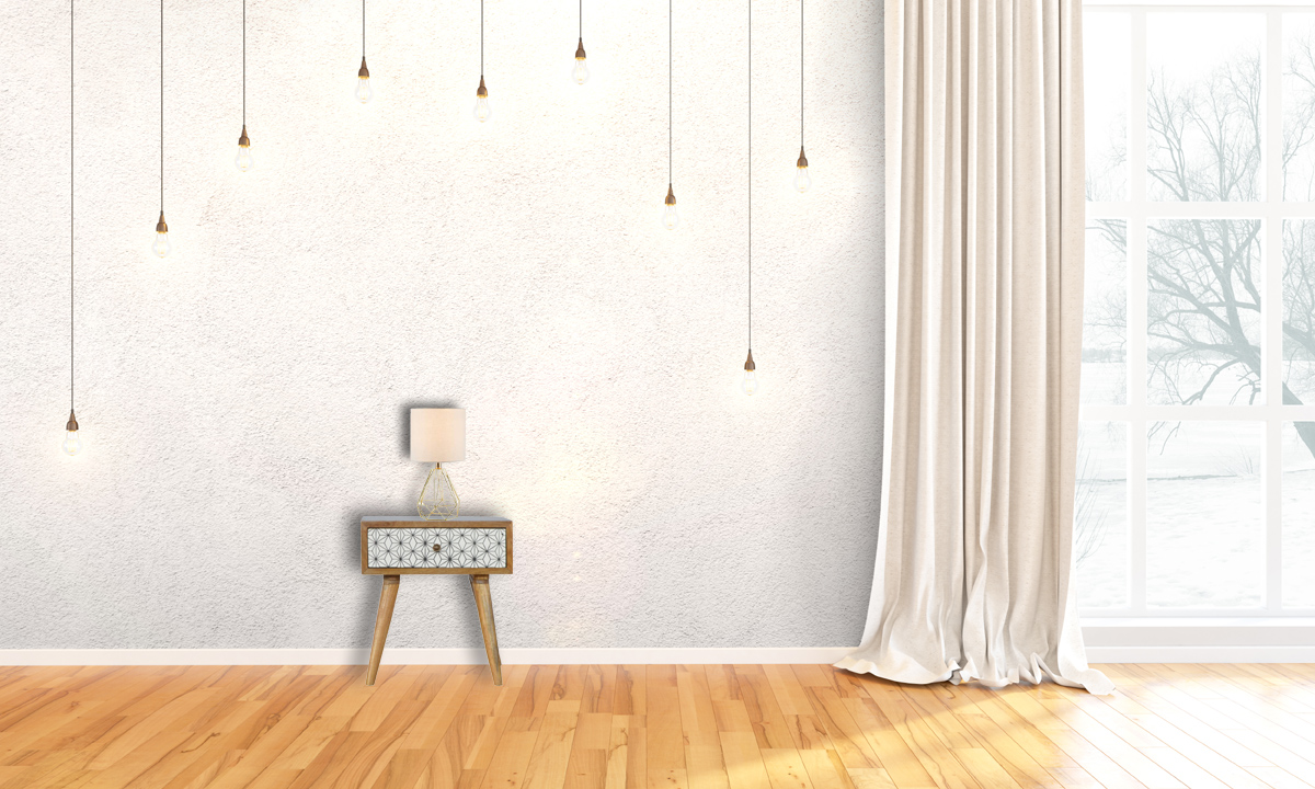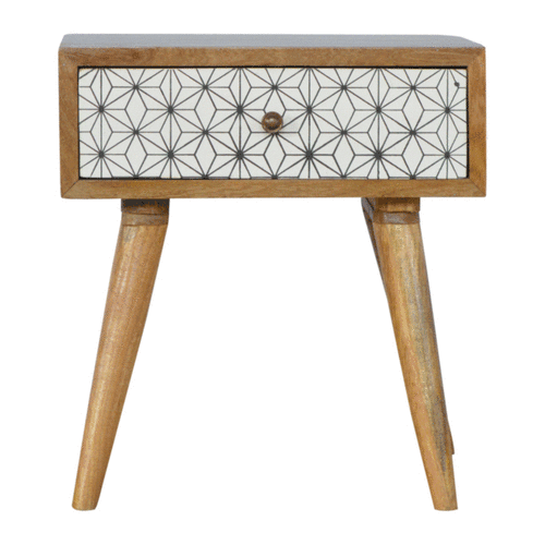 This nightstand table is the perfect addition to add to any bedroom. It will prove handy all over your home and is made from 100% solid mango wood with a fine oak-ish finish. It also comes with a geometric screen printed drawer that has a shiny knob and has 4 Nordic style legs.