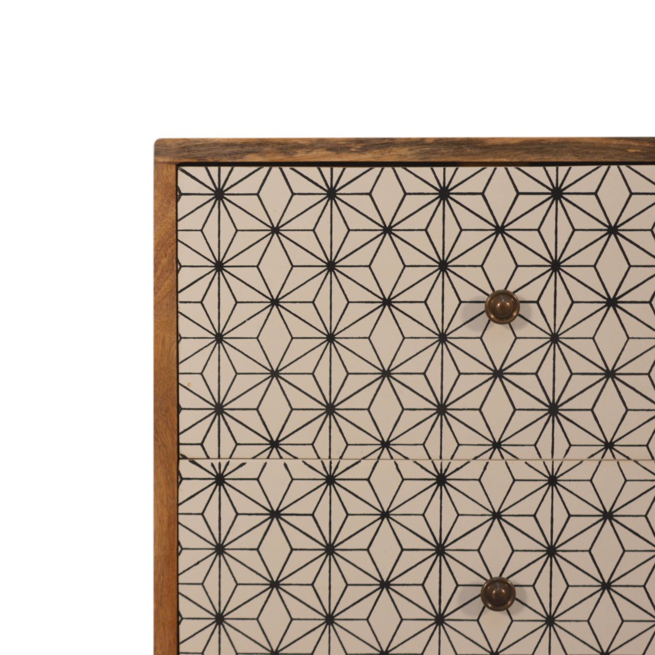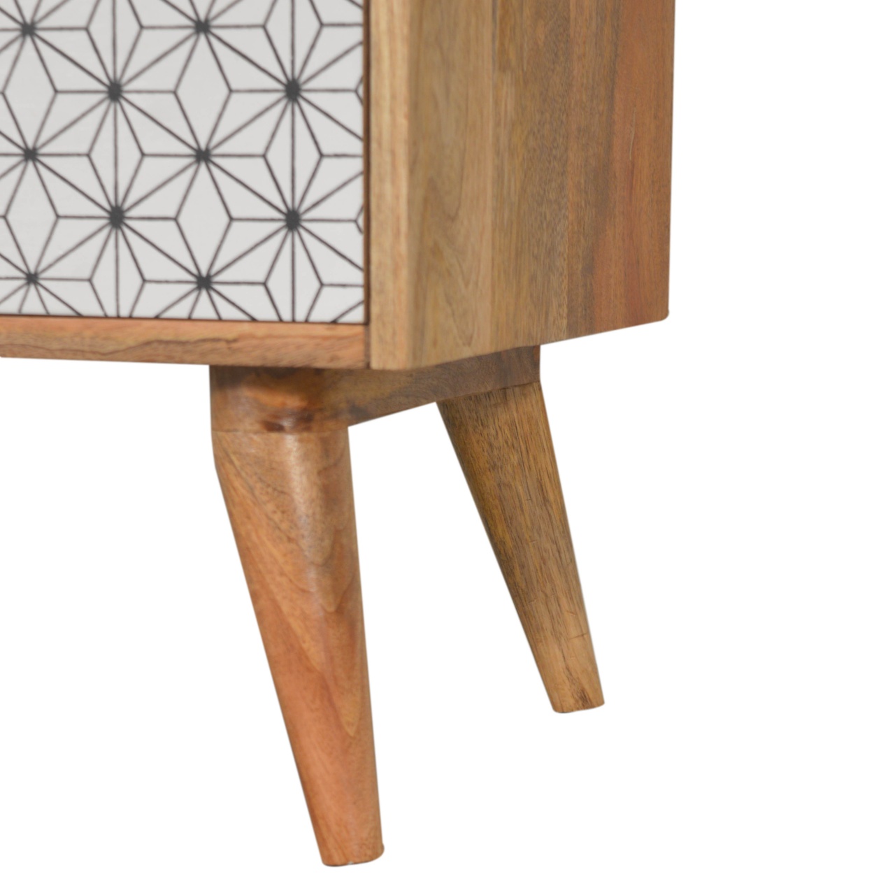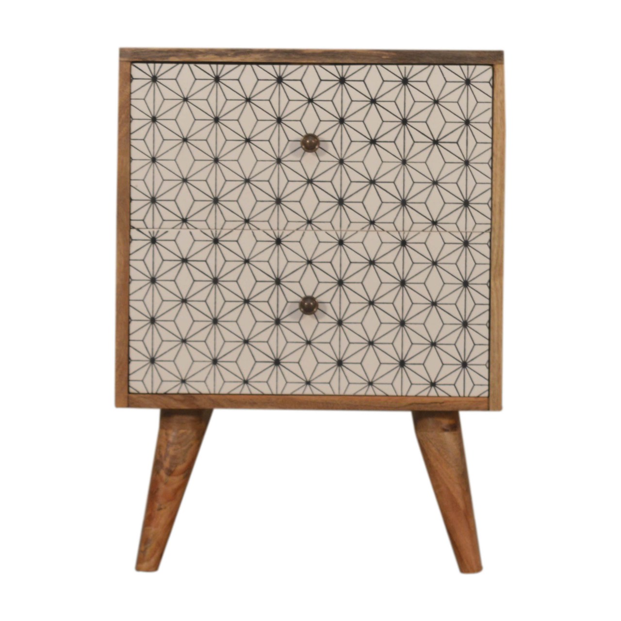 This 2 drawer nightstand has been constructed from 100% solid mango wood and finished in a fine oak-ish finish body. The main features of this piece are the screen-printed drawer fronts which have a beautiful black and white geometric design giving the piece extra dimension and character. It also has 4 Nordic style legs, knobs and ample space on top for a lamp, photo frames or ornaments.
