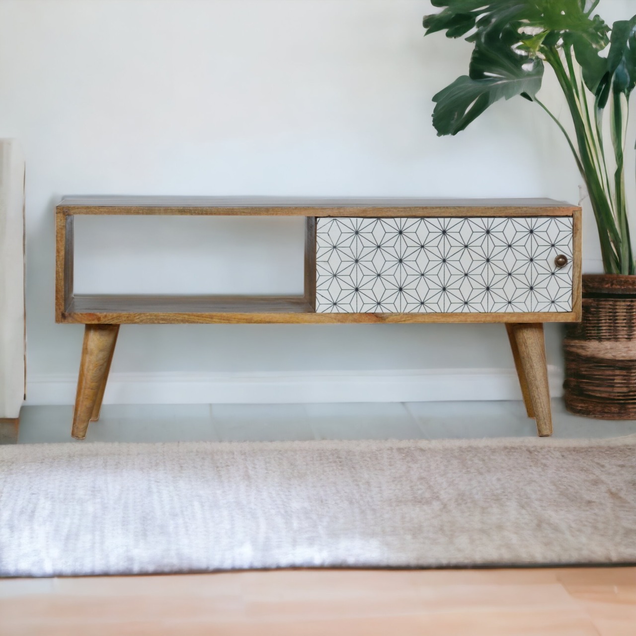 This solid wood coffee table features 1 open slot and 1 geometric screen-printed door front giving the piece extra dimension and character. Constructed from solid Mango wood in an Oak ish finish this piece has been built to last offer enough storage for bits like books and magazines. It features 4 Nordic style legs which complement the body nicely and gives the entire piece a contemporary look. The perfect addition to the home.