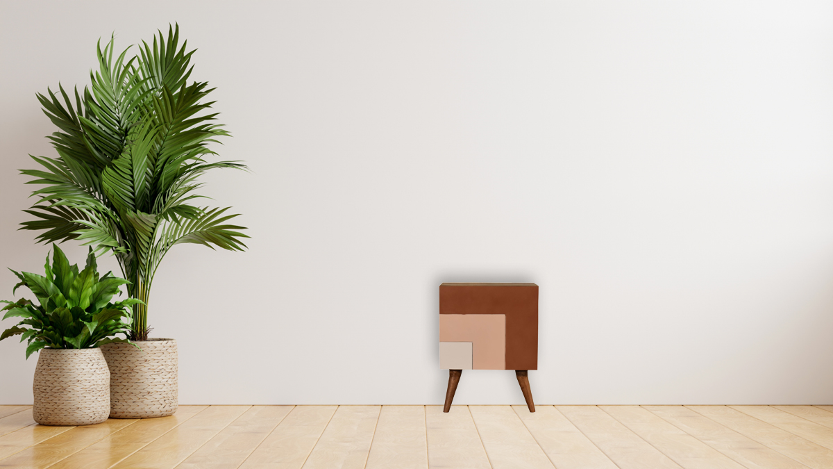 Offering a clean, sharp L pattern design and hand-painted in 3 rich shades of brown this nightstand offers plenty of room on top for a lamp, photo frame, or books. Storage is offered with one door which can be used to easily store bits and pieces and keep them close and handy before bedtime. Other features include nordic style legs and the body is constructed from 100% solid mango wood.