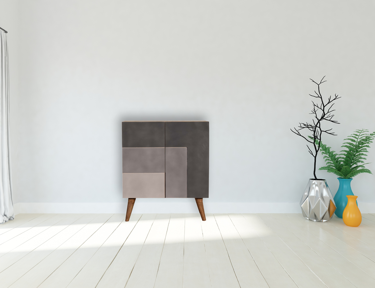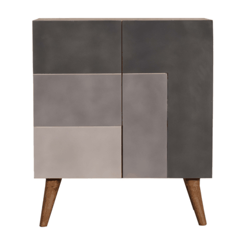 Offering a clean and sharp L pattern and hand painted in 3 rich shades of grey this cabinet offers plenty of room on top for a candle, ornament or plant. Storage is offered with two doors which can be used to easily store bits and pieces with the space of 2 drawers. Other features include Nordic style legs and the body is constructed from 100% solid mango wood.