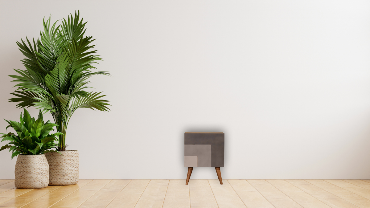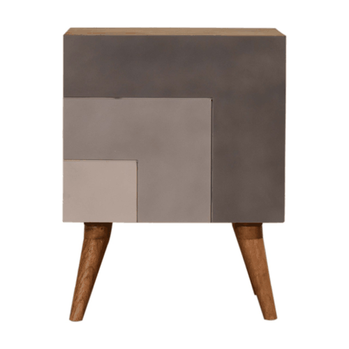 Offering a clean and sharp L pattern and hand painted in 3 rich shades of grey this nightstand offers plenty of room on top for a lamp, photo frame or books. Storage is offered with one door which can be used to easily store bits and pieces and keep them close and handy before bedtime. Other features incude nordic style legs and the body is constucted from 100% solid mango wood.