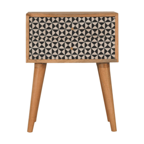 Part of our Rafina range this nightstand has been constructed from 100% solid mango wood in an oak-ish finish. It has 2 Black Resin Inlay drawers for storage convenience, Nordic style legs and the shiny knobs gives a lovely contrast against the print. More items are available from the Rafina range.