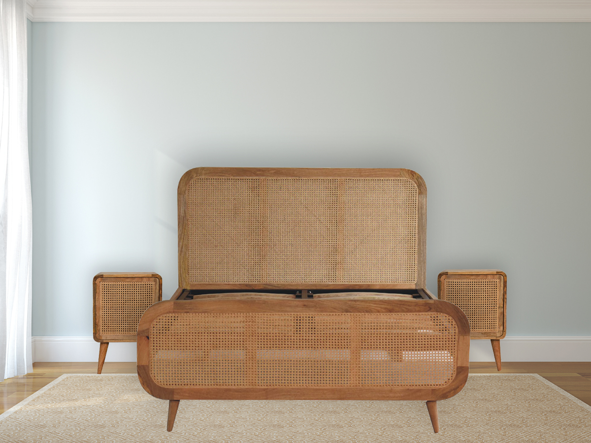 Experience the ultimate in elegance with our Rattan Bed. Crafted from 100% solid mango wood in a oak-ish finish, the headboard and footboard showcase exquisite curves with a rattan design throughout. This masterpiece boasts a metallic frame with 18 wooden slats, ensuring durability and comfort. Nordic-style legs add a touch of sophistication. Transform your bedroom into a haven of style and tranquility. The box will contain 1 x headboard, 1 x footboard, 2 x side rails, 1 x metallic frame with 18 wooden slats (embedded in metallic frame), 4 x legs, 1 x hardware bag, total number of units in box = 9 units. Please note the bed does not include the mattress, duvet cover or pillows.