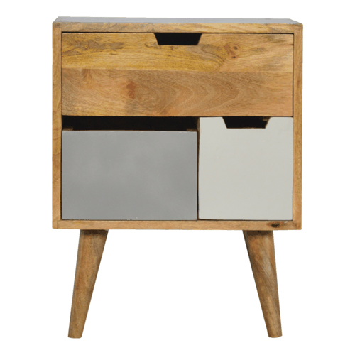 This mini handy Nordic nightstand has been constructed from 100% solid wood. It features 1 cut out solid wood drawer and 2 removable grey gradient hand painted drawers which can be switched around. It can stand alone or be partnered with the other grey painted pieces from the range for a completed look. The perfect addition to the living room or bedroom.