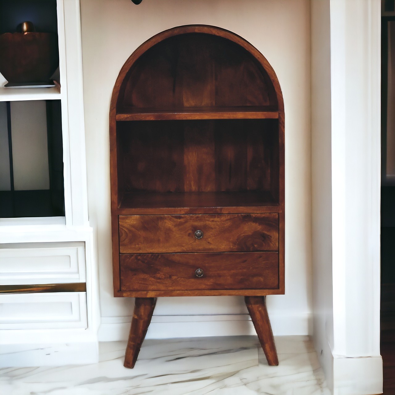 Hand crafted from 100% solid mango wood and featuring nordic style legs with shiny brass knobs, this sophisticated cabinet makes a stunning statement in any living space – and boasts an abundance of space for plants, books, and ornaments with 2 open shelves and 2 drawers.