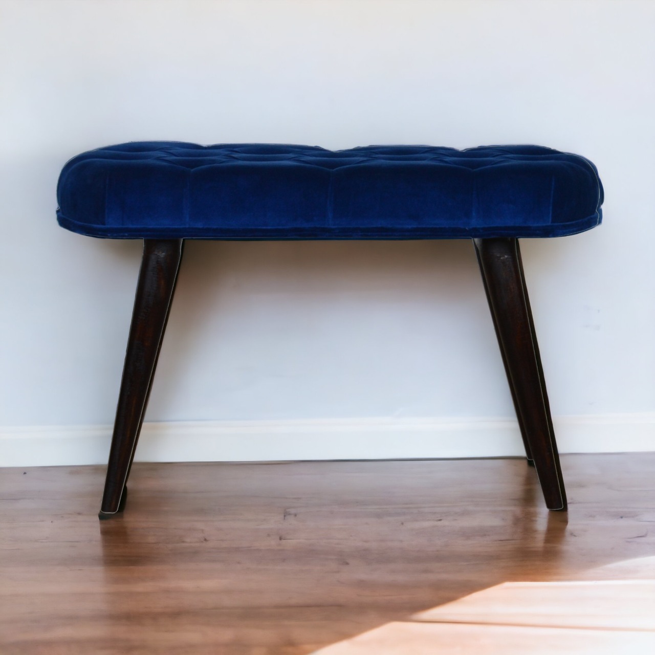 This Nordic style bench has been upholstered in a beautiful Royal Blue cotton velvet fabric and features a classy deep-button design on the top. The bench stands on 4 legs constructed from 100% solid mango wood in a walnut finish and it is the perfect piece to add to your bedroom or hallway as a finishing touch in the home.