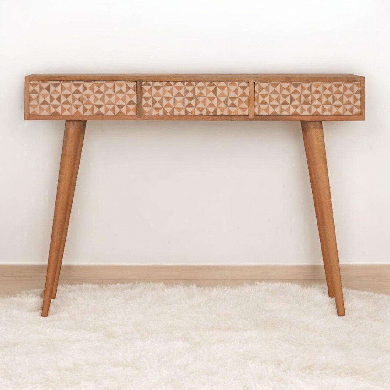 As part of our Sarina Range, this console table has been constructed from 100% solid mango wood in an oak-ish finish. It has 3 White Resin Inlay drawers for storage convenience and features Nordic style legs with shiny knobs which give a lovely contrast against the print. More items are available from the Sarina range.
