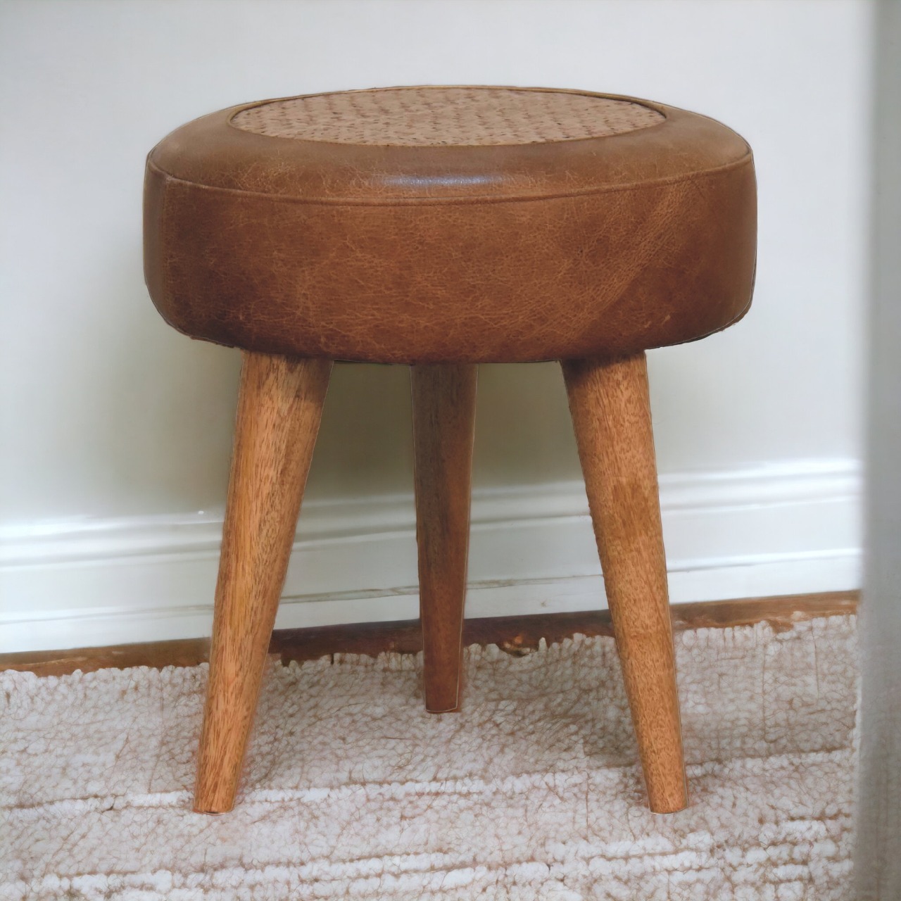 Featuring a seagrass centre base with a buffalo leather hide rim, this footstool is constructed from 100% solid mango wood with oak-ish finish legs, ensuring it is stable and durable in the home. It provides a beautiful contrast between both fabrics, and is multi functional meaning it can be used both in the living room and bedroom.