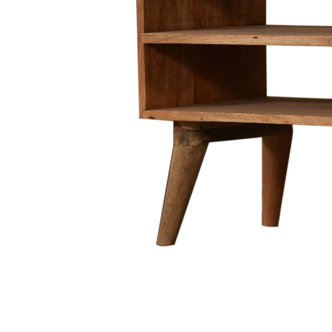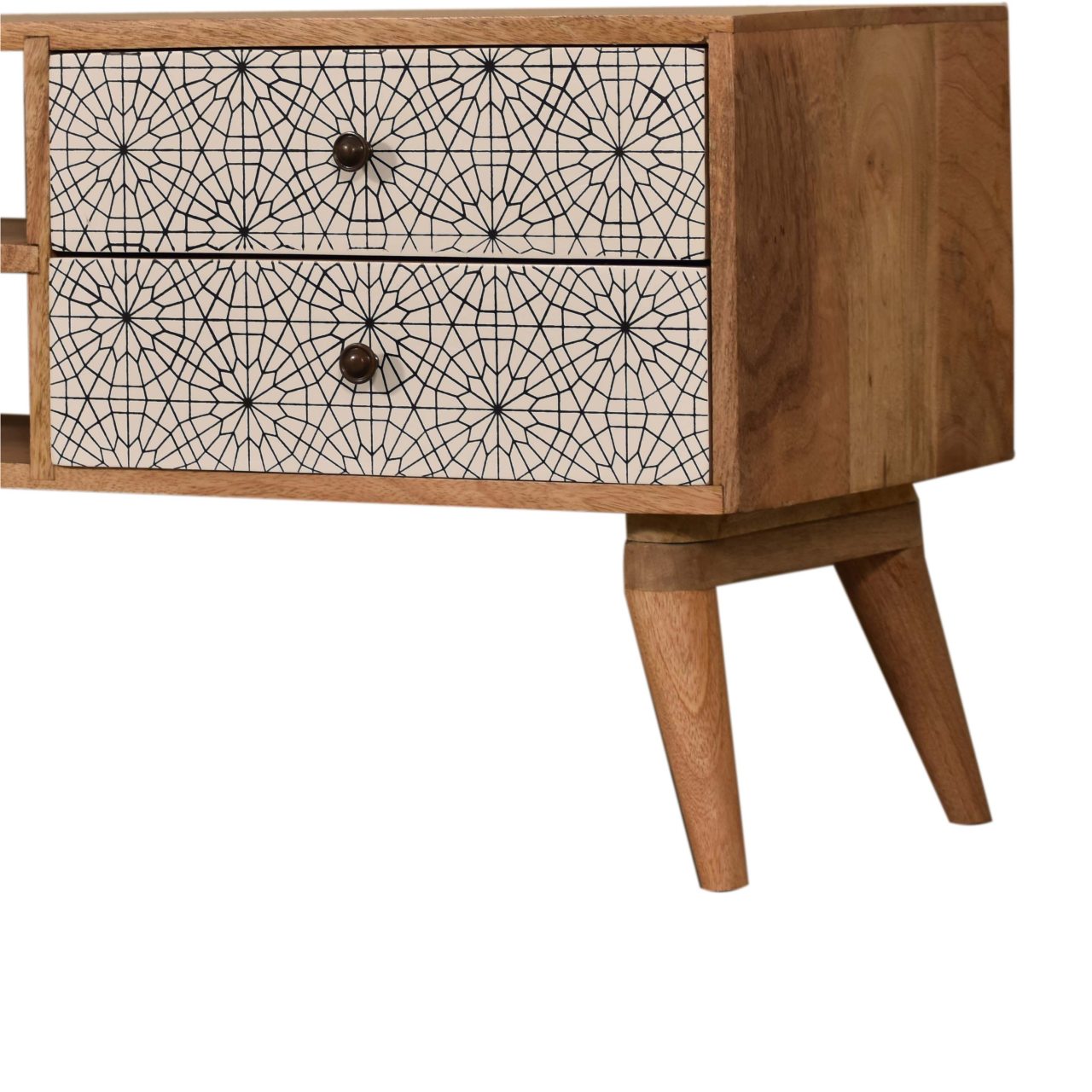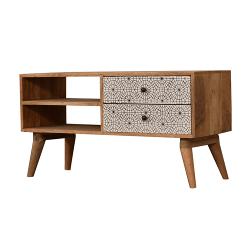 This 2 drawer media unit has been constructed from 100% solid mango wood and finished in a fine oak-ish finish body. The main feature of this piece are the screen printed drawer fronts and which each have a beautiful black and white geometric design giving the piece extra dimension and character. Useful storage is provided with the open slots and drawers that can be used to store any CD’s, films or books.
