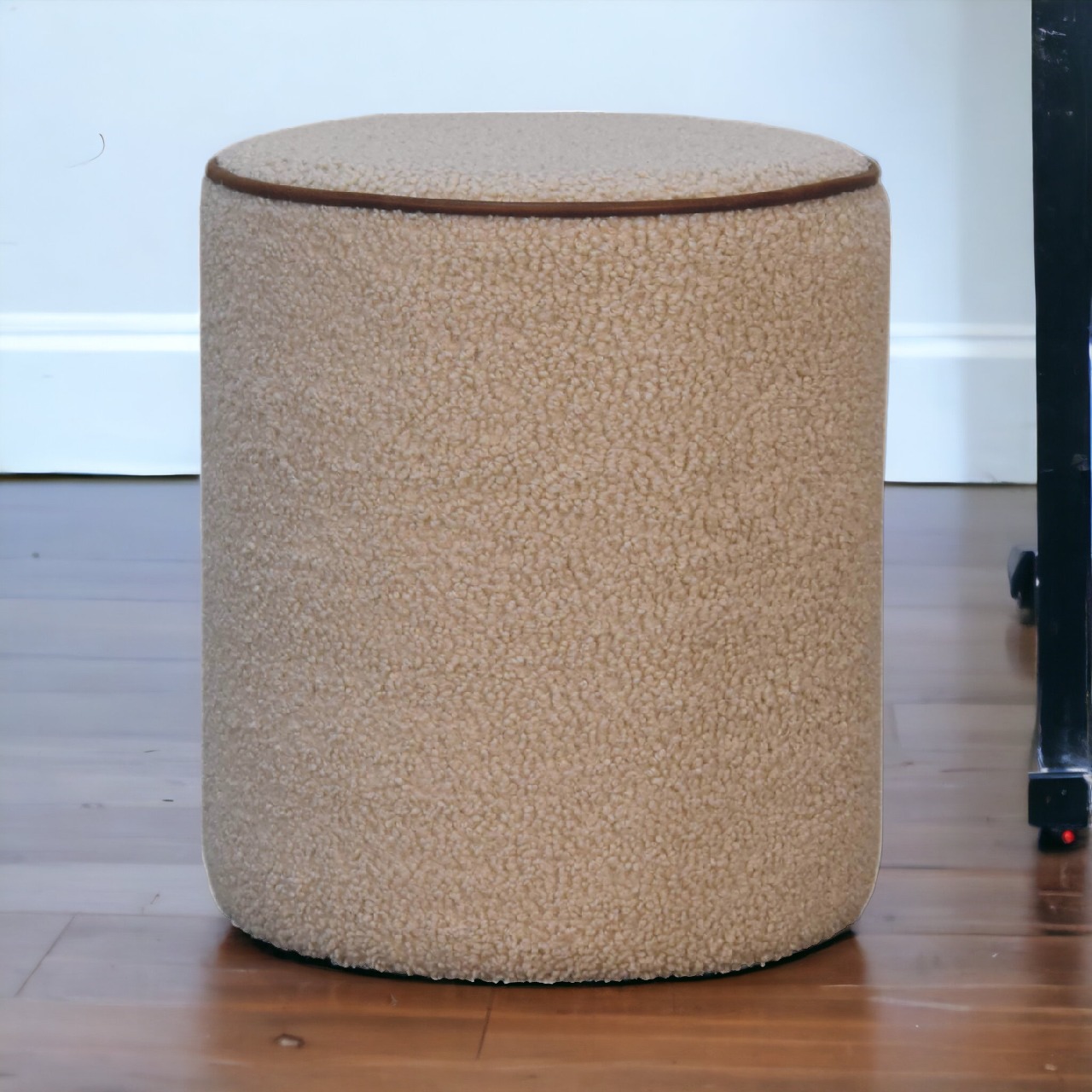 This beautiful and fashionable round footstool is the perfect addition to any bedroom or living room. It is upholstered in a luxurious cream boucle fabric and has buffalo leather piping around the rim for extra dimension and character, perfect for putting your feet up, using it as a handbag stand, or as an accent piece in the home.