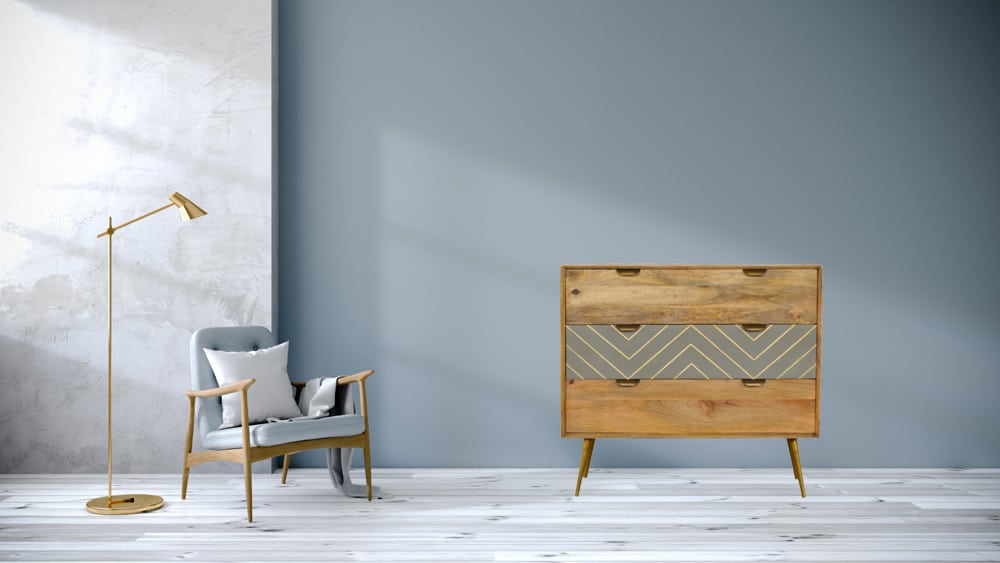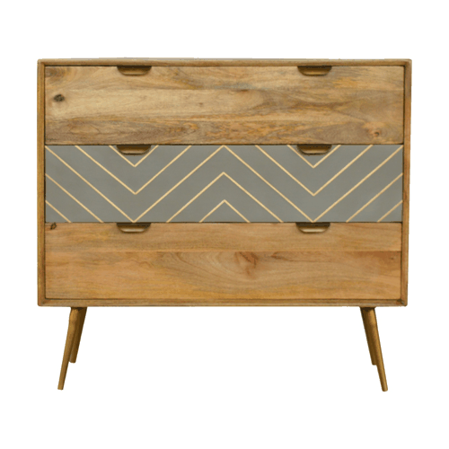 Add this chest of drawers to your home for a modern and classy look. This unique style of chest of drawers will offers compliments to any home. The cement drawer and golden brass inlay feature offer a sleek look that would look perfect with the other pieces from the collection or stand graciously alone. It has been constructed from 100% solid mango wood in an oak-ish finish with 4 gold nordic style feet which compliment the wooden body perfectly ensuring this piece can withstand many years of use and satisfaction whilst remaining its golden beauty.