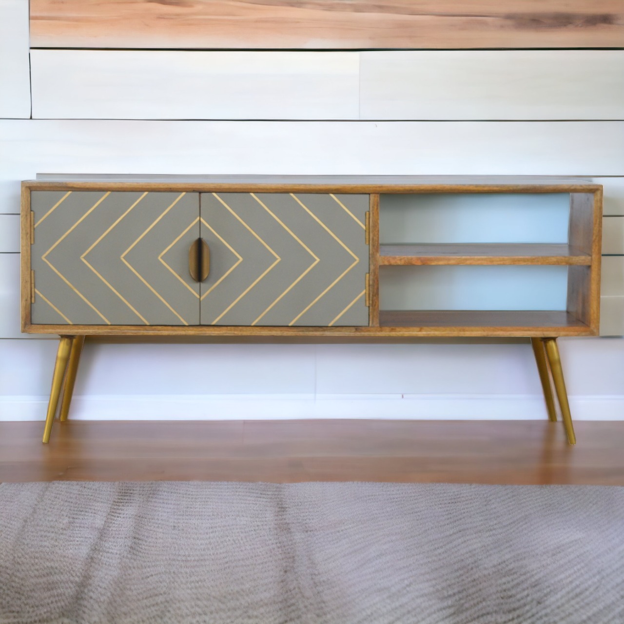 This media unit has been inspired by a clean and modern finish design. It has been constructed from 100% solid mango wood in an oak-ish finish and its main feature is the grey cement door fronts with a beautiful golden brass inlay and 4 gold Nordic style feet which compliments the wooden body perfectly. It has 2 open slots for storing any bits and pieces for placing any books, magazines, or ornaments for quick access. It can be partnered with the other pieces from the collection or stand graciously alone._x000D_