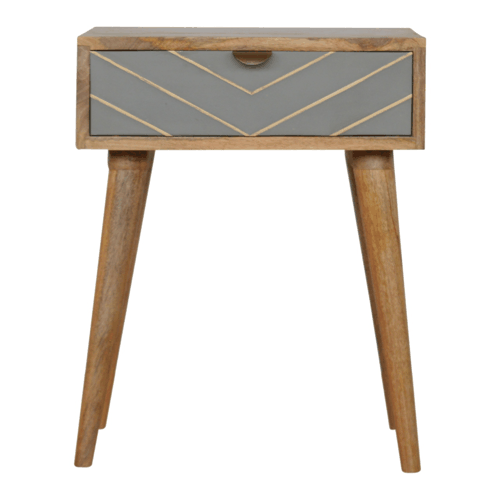This nightstand has been inspired by a clean and modern finish design. It has been constructed from 100% solid mango wood in an oak-ish finish and its main feature is the grey cement drawer front with a beautiful golden brass inlay and 4 gold Nordic style feet which compliment the wooden body perfectly. It has 1 drawer for storing any bits and pieces before bedtime and can be partnered with the other pieces from the collection or stand graciously alone.