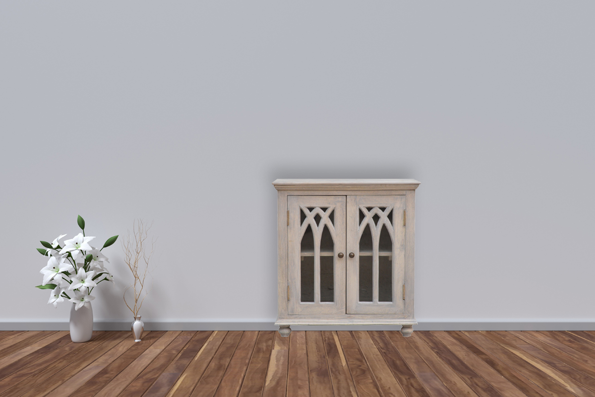 This sideboard is made from 100% solid mango wood and has smooth acid wash stone finish. This product offers excellent storage space with 2 drawers and 2 glazed door cabinets which have a solid wood pattern, and a decent size top to place pictures and special ornaments etc. Other features include 4 bun feet, round knob handles made from brass metal and a thick top. Add this stunning sideboard to your home.