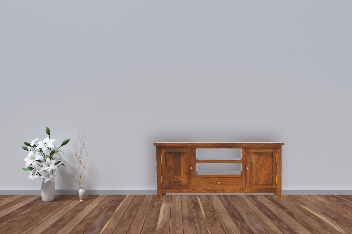 Our solid timber media unit is expertly constructed from 100% solid mango wood, and has fine light walnut finish and simple design to suit most homes. This piece features 4 Scandinavian styled feet, 3 drawers, 2 shelves and 2 door cabinets. Other features include round shiny knobs and a large table top to place your TV or special ornaments.