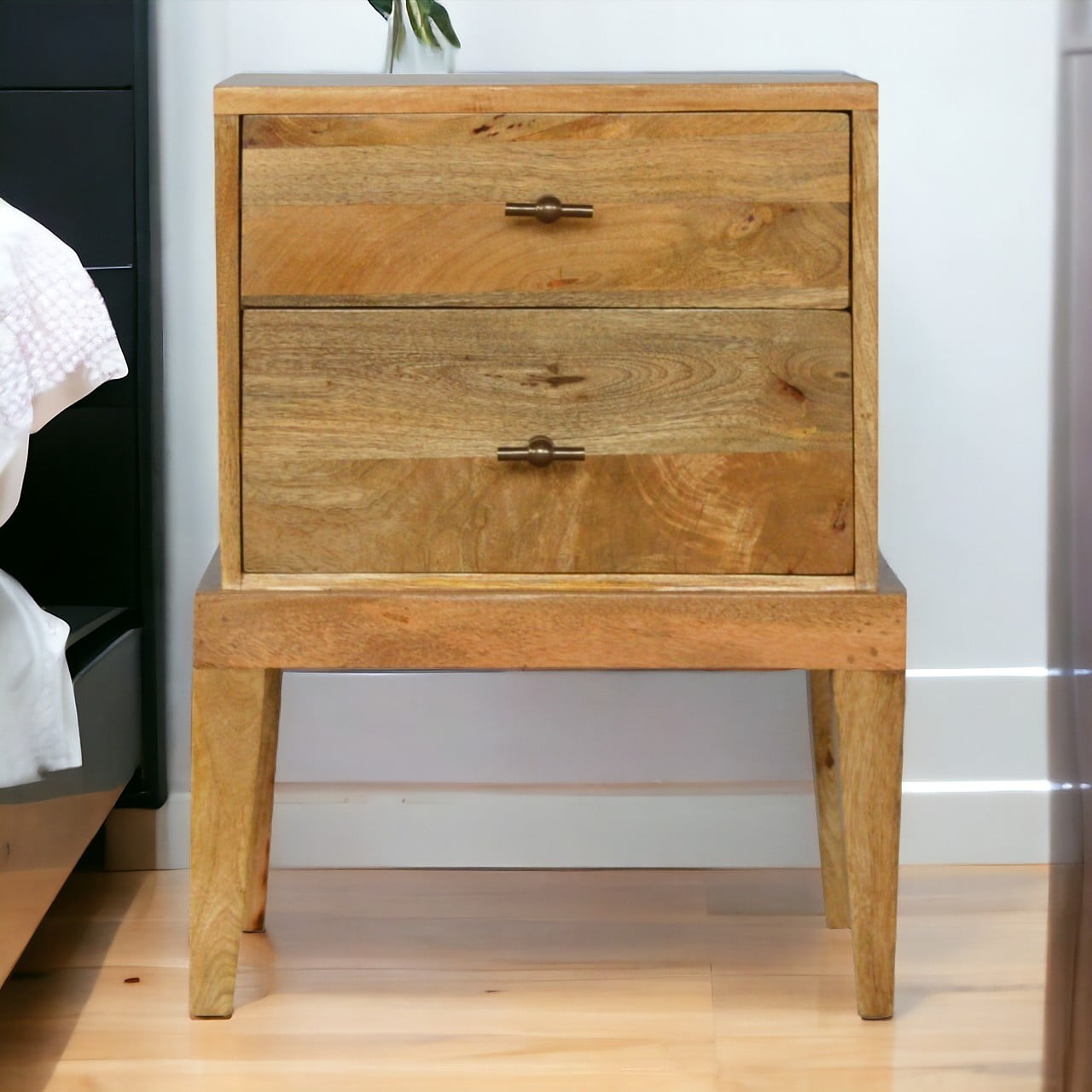 This 2 drawer nightstand table takes a slightly different twist on furniture. Featuring a raised platform base with 4 Nordic style legs and 2 handy drawers featuring T-Bar knobs for storing any bits and pieces before bedtime. It has been constructed from 100% solid mango wood and has a fine oak-ish finish. The perfect addition to the bedroom that can stand alone or be used as a pair.