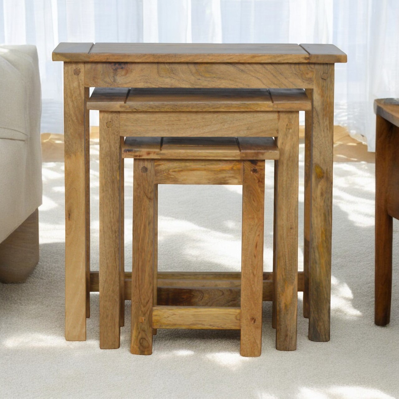 These nesting tables are made of 100% mango wood and are perfect for providing extra space for everyday use. These strong tables are functional and easy to tuck away when not in use. The tables also work stools, providing excellent versatility. With their compact size, these tables are perfect for use in small spaces, and they tuck away when they’re not in use. Each table has an oak-ish finish, wooden pegs, breadboard joints, grooves, and straight farmhouse legs.