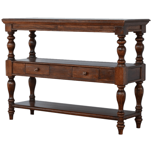Add this elegant console table to your living room. It can be used as an accent piece in the room to place your TV or any bits and pieces like ornaments, candles or a fruit bowl. It features 4 turned legs, 3 shelves and 1 pull out drawer for extra storage. The perfect addition to any home.