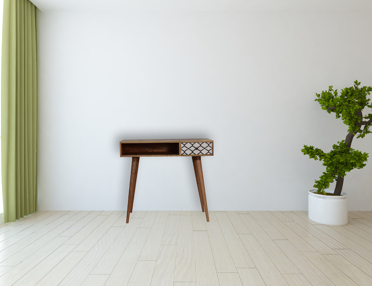 This 1 drawer writing desk has been constructed from 100% solid mango wood and finished in a fine oak-ish finish body. The main feature of this piece is the patterned screen-printed drawer which has a beautiful black and white geometric design giving the piece extra dimension and character. It also has 4 Nordic-style legs, 1 large open slot, and ample space on top for studying.