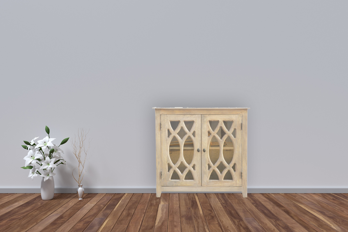 This sideboard is made from 100% solid mango wood and has smooth acid wash stone finish. This product offers excellent storage space with 6 open slots, 3 drawers and 2 glazed door cabinets which have a solid wood pattern, and a decent size top to place pictures and special ornaments etc. Other features include a plinth bottom, round knob handles made from metal and a thick top. Add this stunning sideboard to your home.