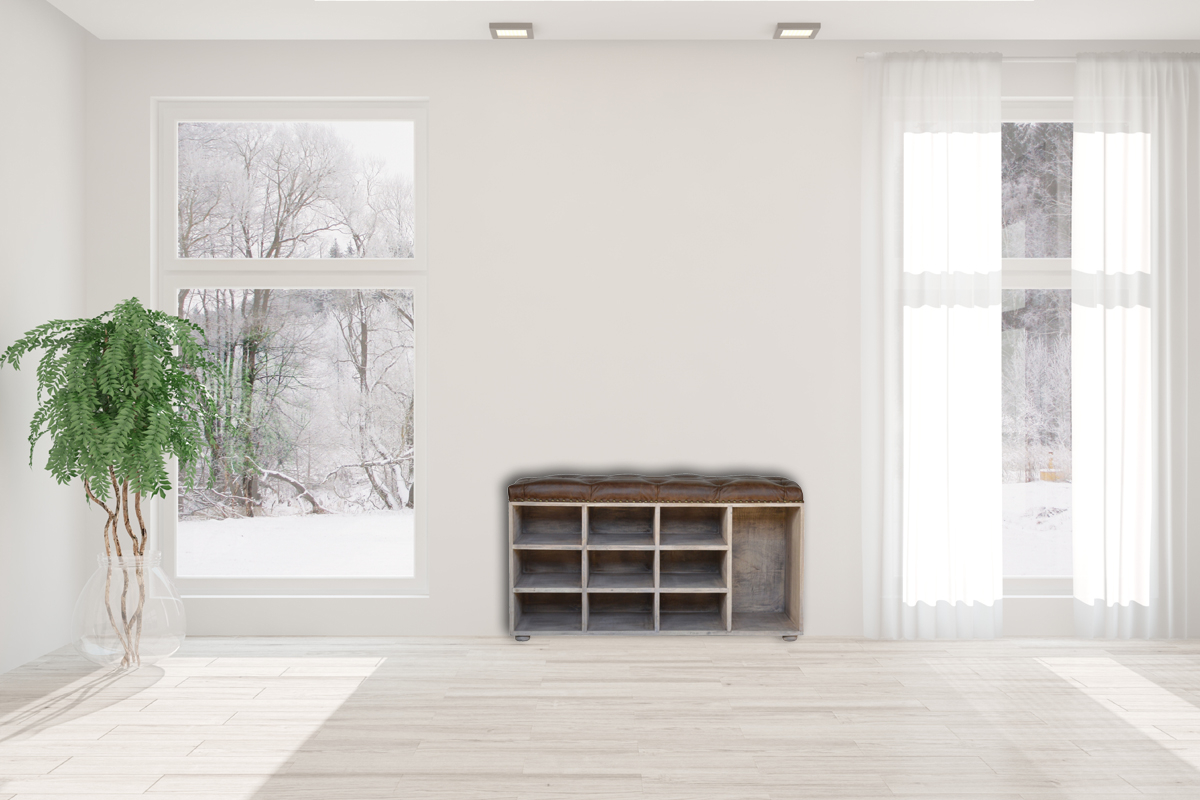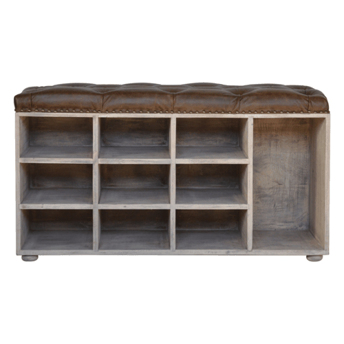 This shoe storage cabinet is extremely useful for any hallway. It is an amazing piece of furniture that features 9 small slots and 1 large slot for shoes as well as boots. The top features a comfy buffalo deep button leather seat with beautiful stud detailing and a solid wood acid wash finish body with 4 bun feet.