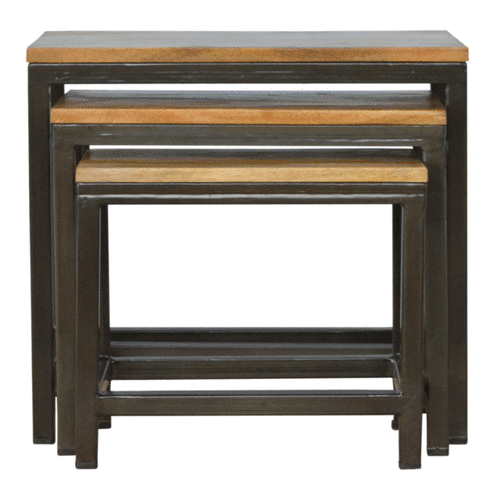 This set of 3 square shaped nesting tables are a beautiful and practical addition to add to your home. The perfect way to show off an industrial style design, the top of the tables are constructed from 100% solid mango wood and the base/legs are made from 100% metal iron. Other features include straight legs which have a pewter finish and the solid wood top has a fine smooth oak-ish finish.