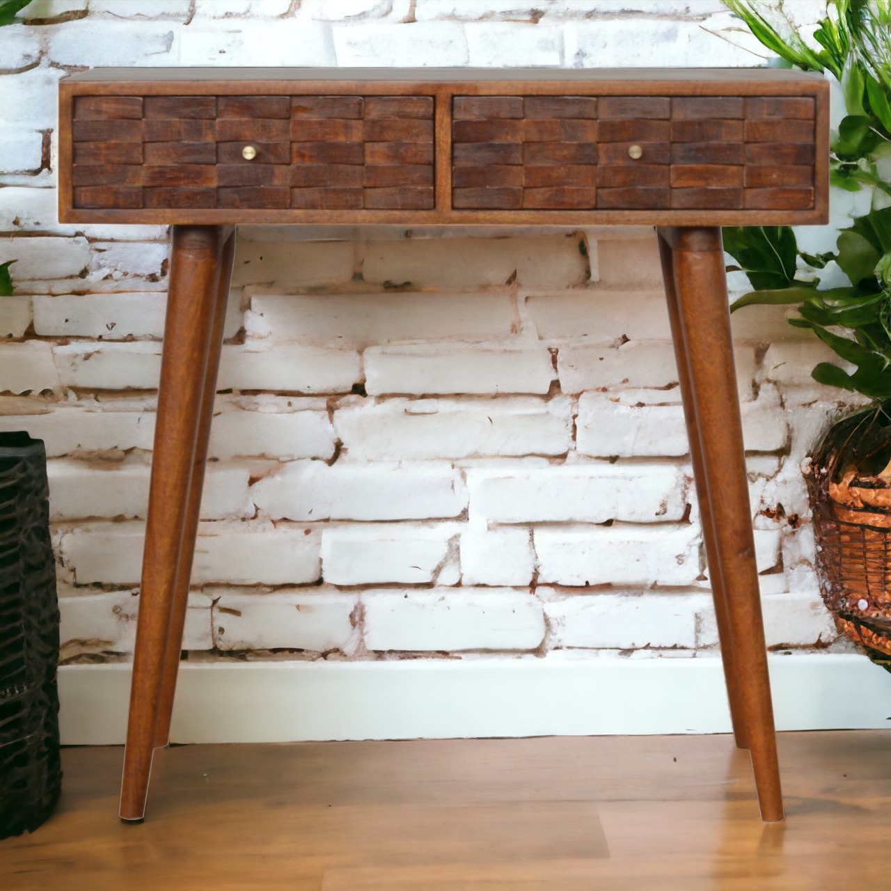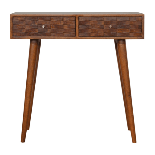This console table has been handcrafted from 100% solid mango wood in a chestnut finish. It features Nordic-style legs with 2 drawers that feature shiny candle knobs. This piece offers a subtle tile hand-carved design on the drawer fronts which will create a modern look in your home and can be paired nicely with the rest of the collection.