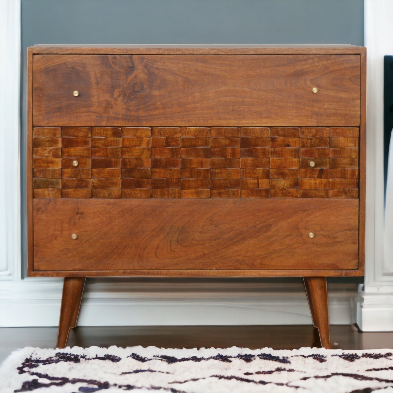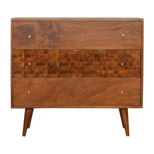 This chest of drawers has been hand crafted from 100% solid mango wood in a chestnut finish. It features nordic style legs with 3 large drawers which feature shiny candle knobs. This piece offers 1 subtle tile hand carved drawer front which will create a modern look in your home and can be paired nicely with the rest of the collection.