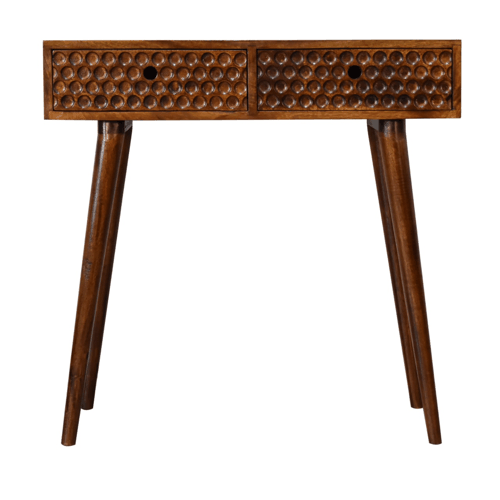 Featuring an attractive circular cut-out design on the drawer fronts, the Torun Console Table is sure to make a stunning statement piece for any living room or hallway. Featuring a chestnut finish on the wood, complete with nordic style legs and round cut-out slots for easy access into and from the drawers this self-assembly console table offers storage with 2 spacious drawers and ample space on top to display plants, ornaments or photo frames.