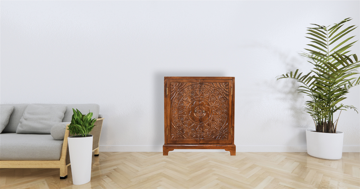 This cabinet features a lovely patterned surface on the door fronts for a modern, minimalist aesthetic. It provides slots inside for storage space for versatile and practical use. It has been constructed from 100% solid mango wood and has a fine chestnut finish and shiny brass knobs.