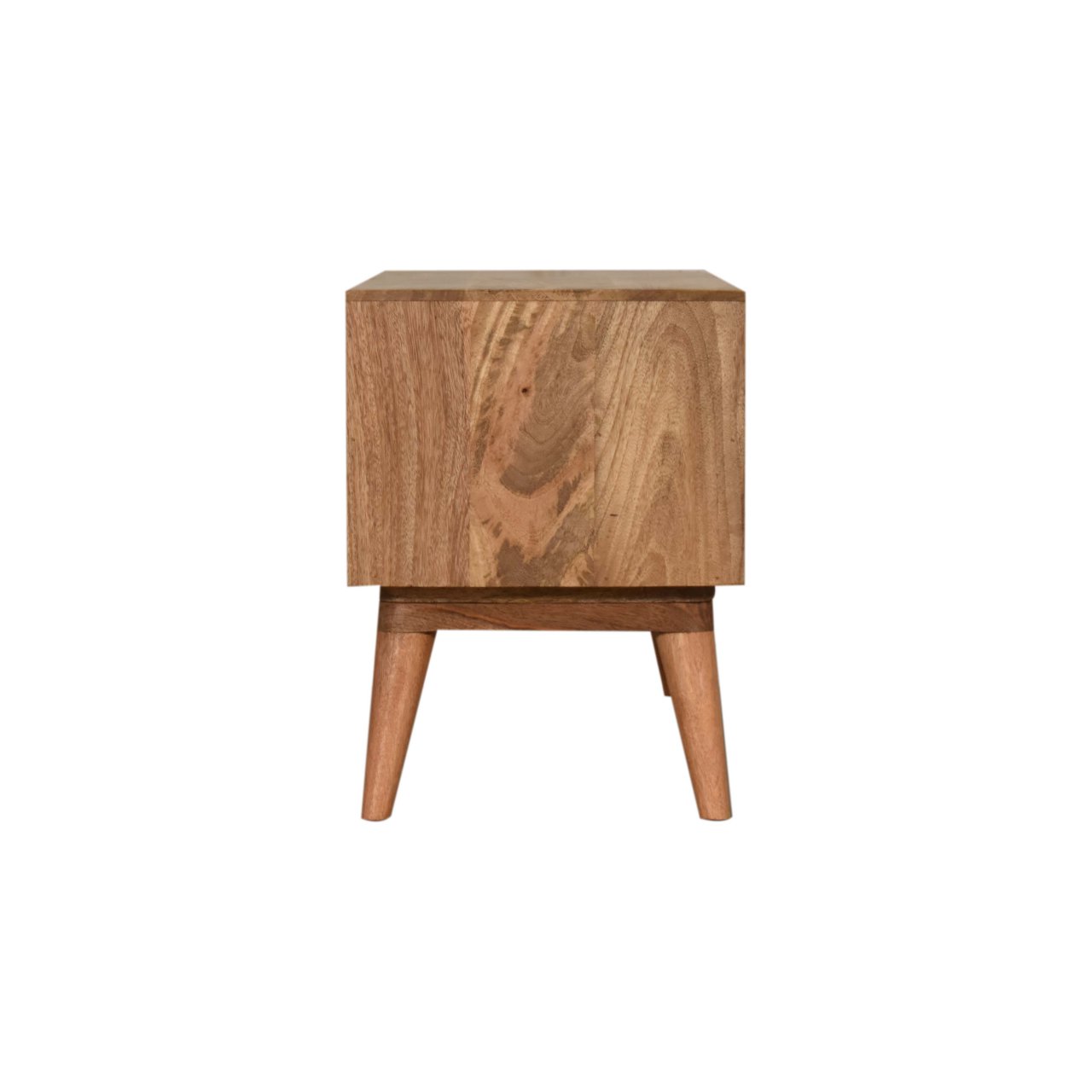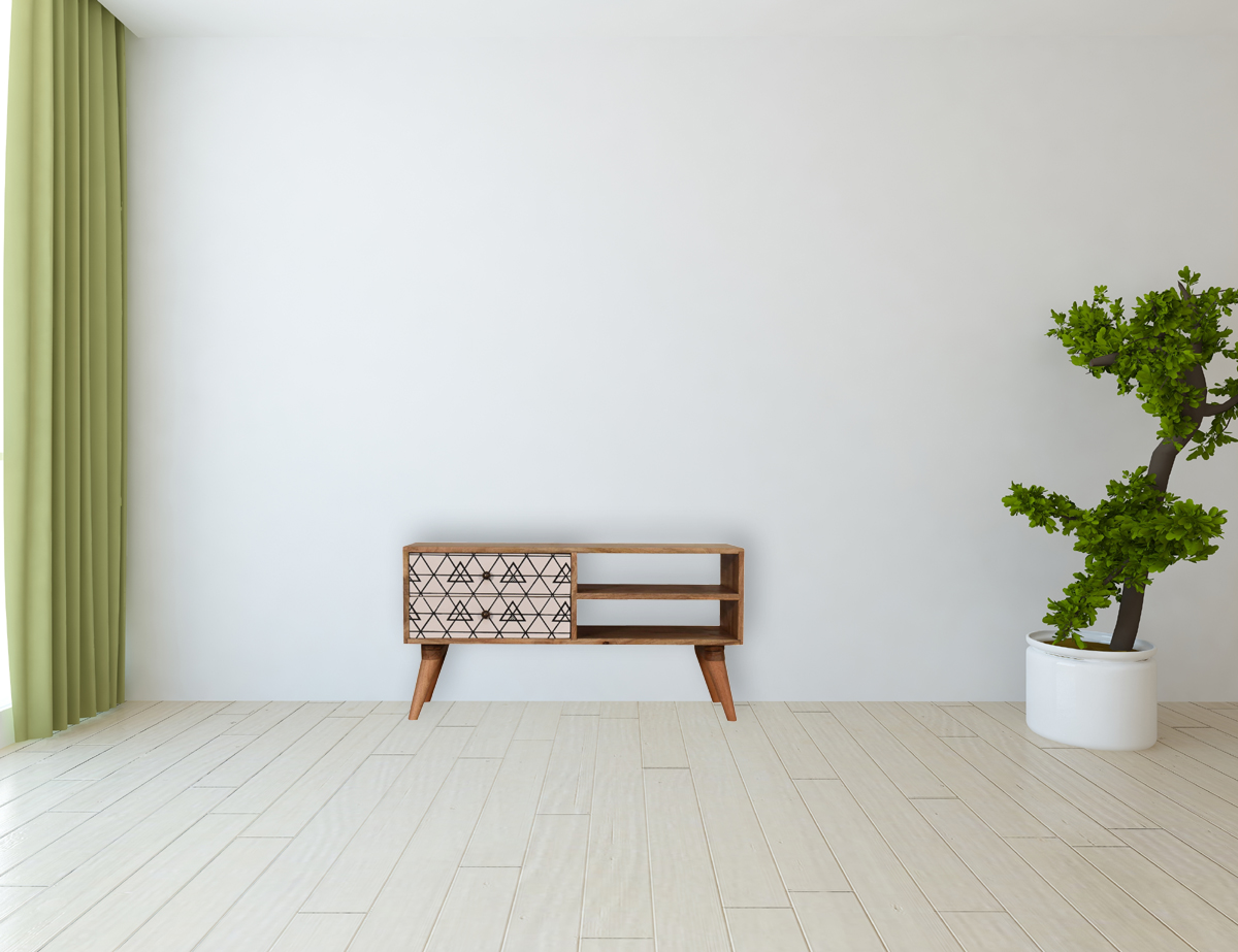 This 2 drawer media unit has been constructed from 100% solid mango wood and finished in a fine oak-ish finish body. The main feature of this piece is the triangle screen printed drawer fronts which have a beautiful black and white geometric design giving the piece extra dimension and character. It also has 4 Nordic-style legs, 2 open slots, and ample space on top for a lamp, photo frames, or ornaments.