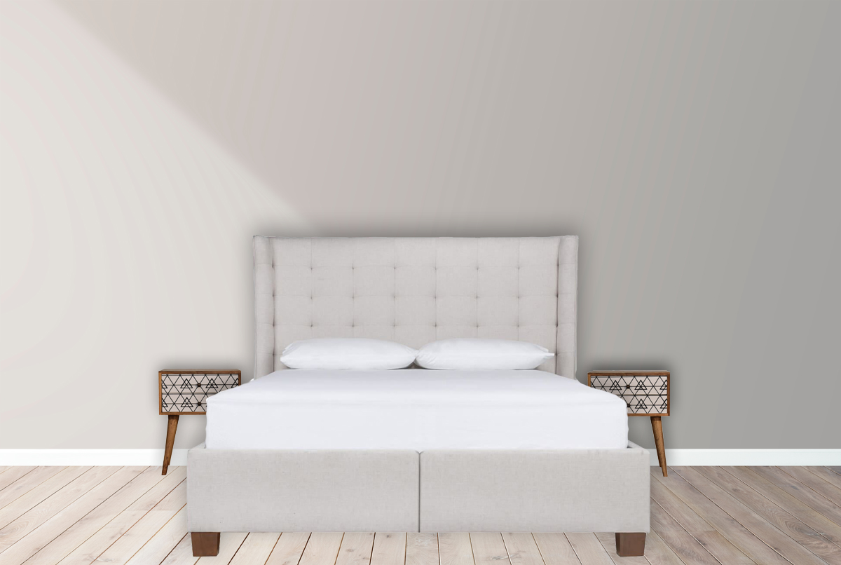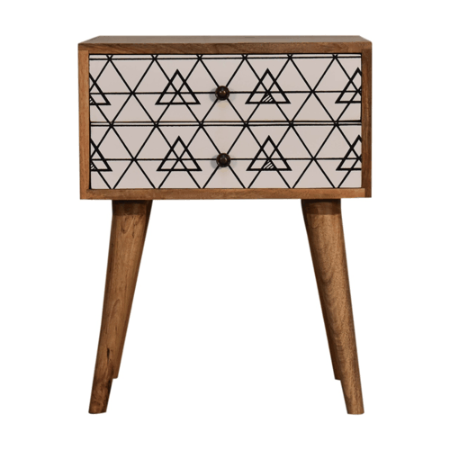 This 2 drawer nightstand has been constructed from 100% solid mango wood and finished in a fine oak-ish finish body. The main feature of this piece are the triangle screen printed drawer fronts which have a beautiful black and white geometric design giving the piece extra dimension and character. It also has 4 Nordic style legs and ample space on top for a lamp, photo frames or ornaments.