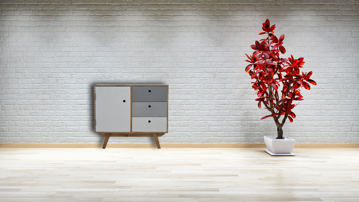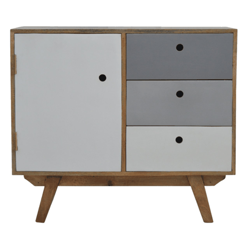 This Nordic style cabinet has been constructed from 100% solid mango wood in an oak-ish finish and features 3 drawers hand painted in two tones of grey and a cabinet with cut out open slots for easy access into the drawers. It can be used to store any bits and pieces in any part of the home and can suit interior styles for modern homes and apartments. It is a versatile product which can stand alone or be paired with the other pieces from the range.
