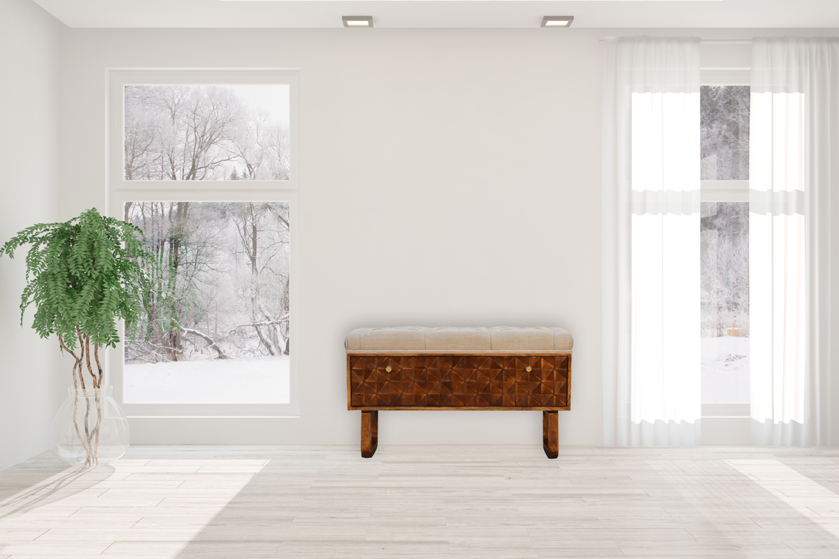 The hand-carved front door front of this hallway shoe storage bench is the major characteristic that distinguishes the pieces in this collection. It has an upholstered mud linen top and is made of 100% solid mango wood with a chestnut finish. Its style is versatile and can fit into a variety of homes, so it may be paired with other items from the collection or used alone.