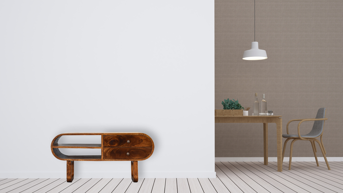 This media unit is an architectual piece of beauty with it having the functionality to be used in many different ways. It gives plenty of storage space for whatever you see necessary while its robust and sturdy design means it will last for a long time. It is made with 100% solid mango wood with an chestnut finish.