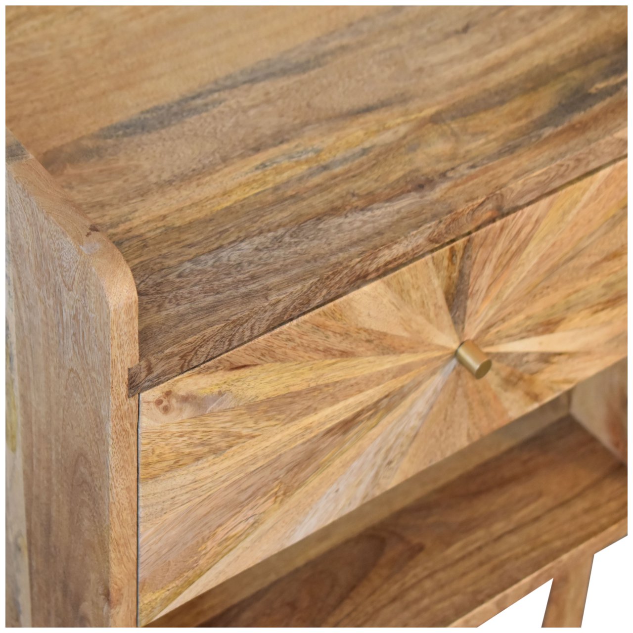 This nightstand is perfect when it comes to keeping your bedroom orgasnised and keeping little bits close to you before bedtime. The sunrise design brings a more elegant and eye-catching display while proving handy all over your home. It is made with 100% solid mango wood with a fine oak-ish finish.