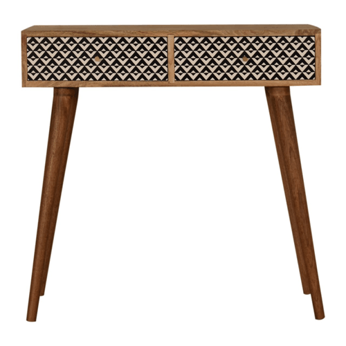 This console table has been constructed from 100% solid mango wood in a fine oak-ish finish. The 2 drawers feature a black and white screen printed pattern which is bound to uplift your living room or hallway and allow you to store any bits and pieces discreetly. It also has 4 Nordic style legs and ample space on top for a plant, candle or ornament.