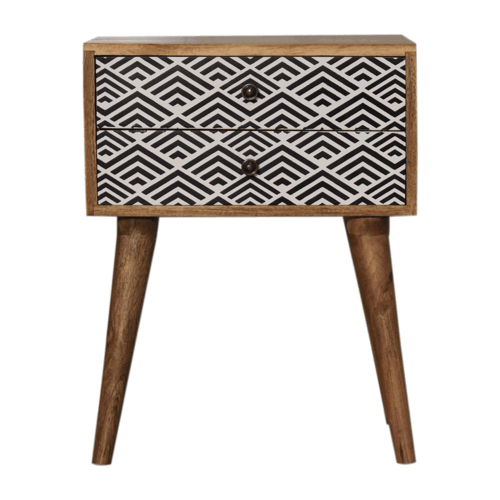 This 2 drawer nightstand has been constructed from 100% solid mango wood and finished in a fine oak-ish finish body. The main features of this piece are the screen-printed drawer fronts which have a beautiful black and white geometric design giving the piece extra dimension and character. It also has 4 Nordic-style legs and ample space on top for a lamp, photo frames, or ornaments.