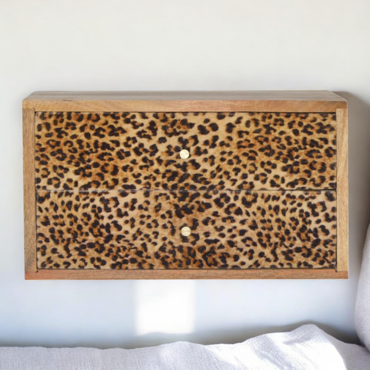 This wall-mounted animal print nightstand has been constructed from 100% solid mango wood in an oak-ish finish with leopard print drawer fronts and candle knobs. It is a practical and stylish solution when you have limited space in the home. It can be used to place a lamp, ornament, or photo frame, with the addition of generous size drawers to store away any extra bits.